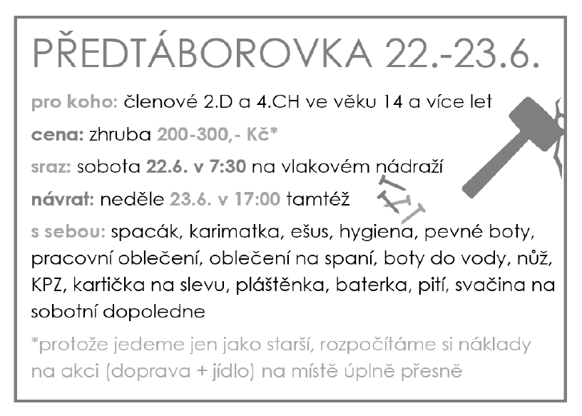 Vážení rodiče, rád bych se Vám omluvil za komplikace týkající se přihlášek na letošní tábor. Bohužel se mi nepodařilo dohledat uschovaná potvrzení od lékaře z předchozích let, a tudíž je nutné, aby si členové i vedení na letošní tábor zařídili nové. Pokračovat na aktualitu