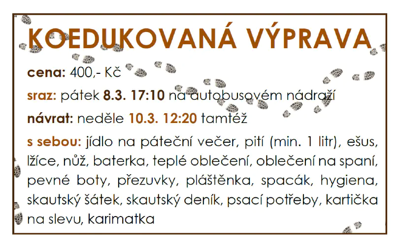 Zdravíme, v pátek 8.3. se uskuteční společná výprava s 2. dívčím oddílem, bližší info viz letáček a email. Momentálně je již kapacita naplněná, ale stále je možné přihlašovat náhradníky skrz odkaz v emailu. Těšíme se na vás v pátek. 🙂 Pokračovat na aktualitu
